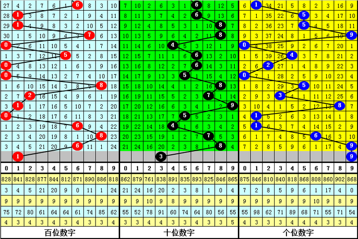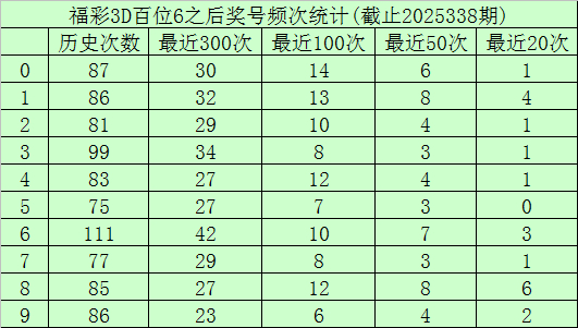 百位杀号:上期百位开出号码6,历史上百位号码6已开出871次了,最近100次百位号码6出现之后,其下期各号码频次隔离为:号码0出现14次,1出现13次,4、8出现12次,2、6出现10次,3、7出现8次,5出现7次,9出现6次。
